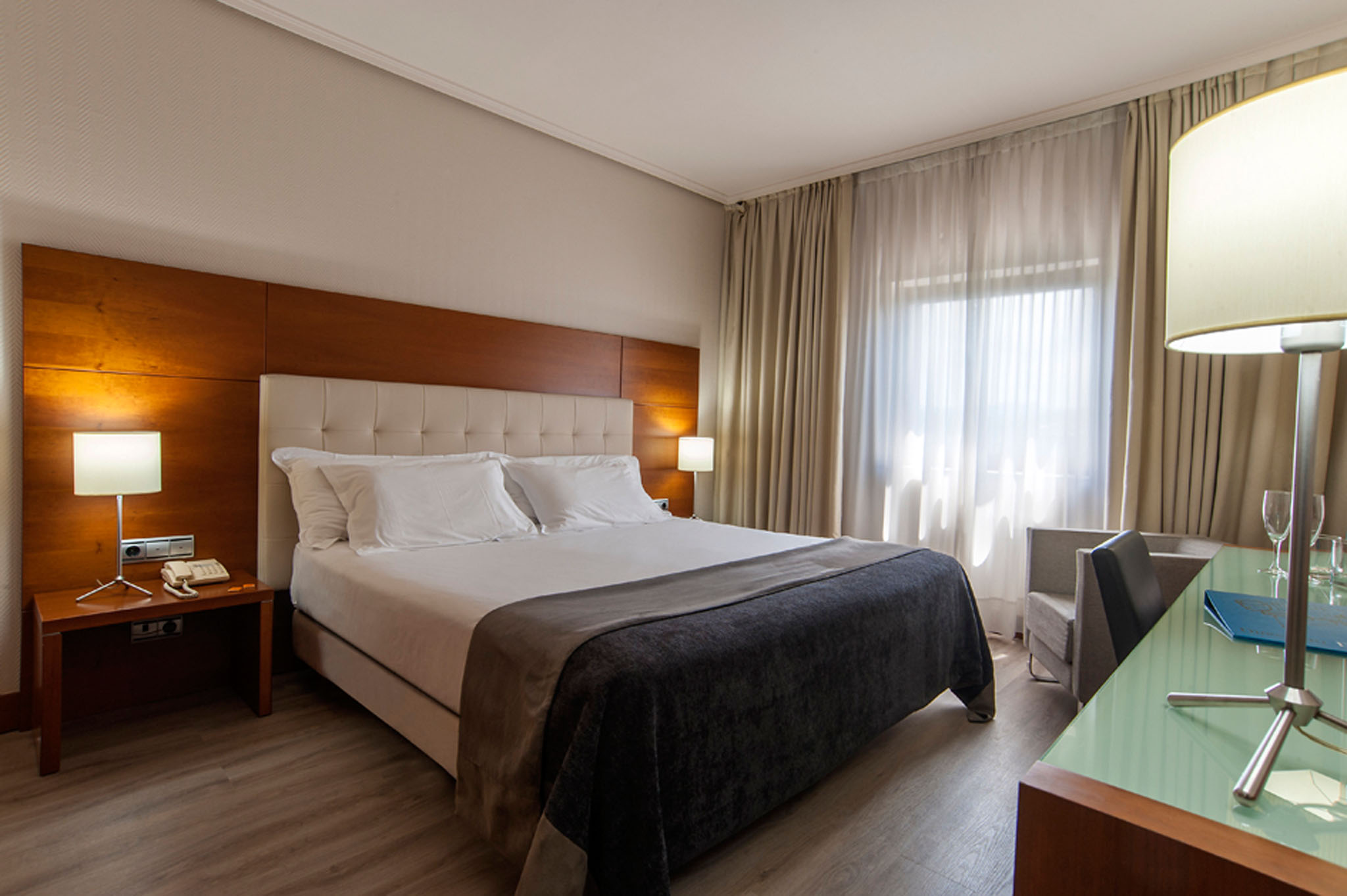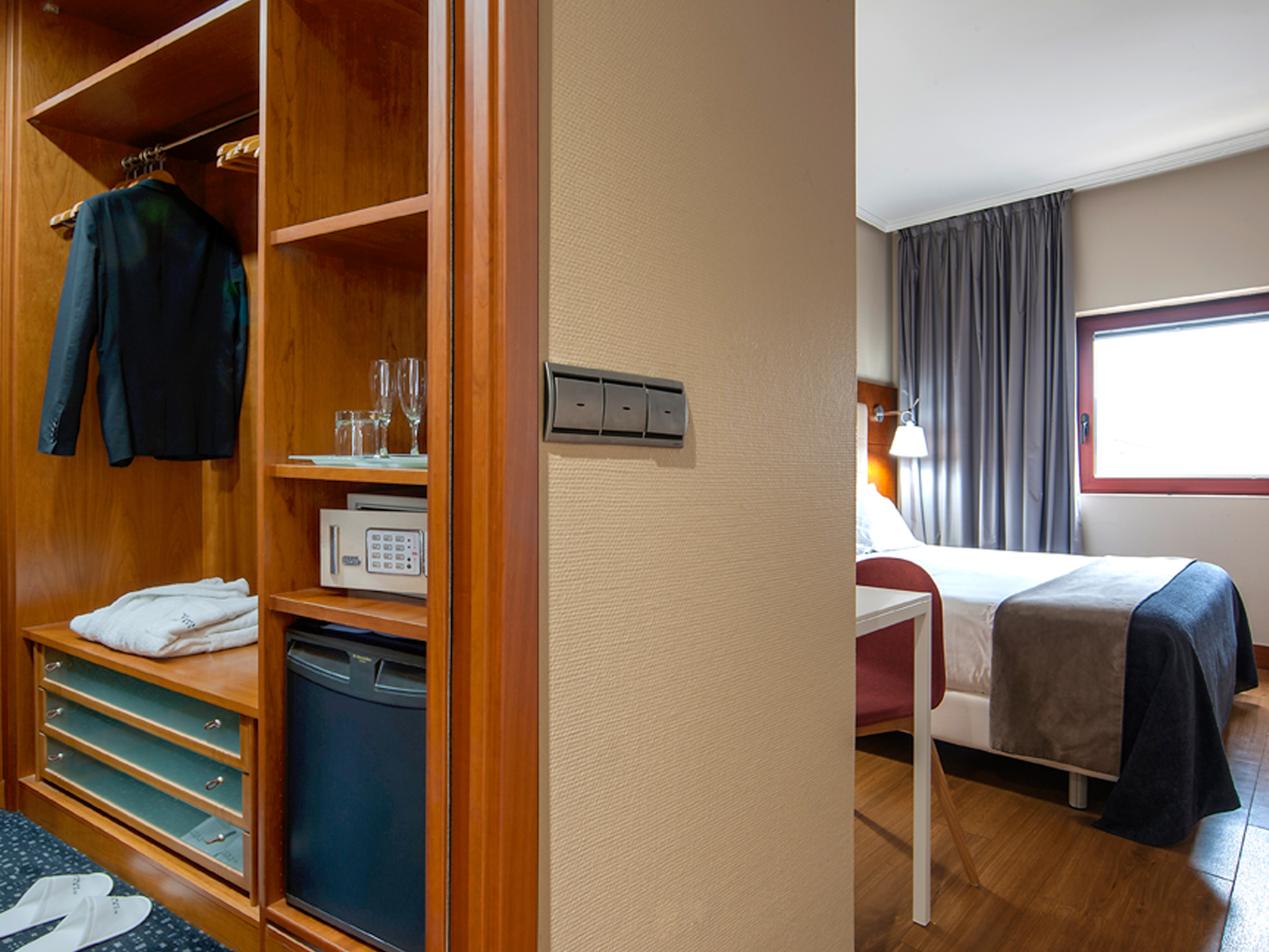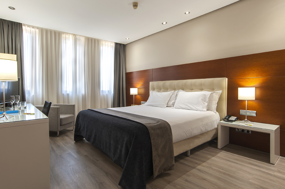 El segundo ambiente, el dormitorio, es una habitación amplia, luminosa, con un diseño funcional y de actualidad y dispone de edredón nórdico y almohadas de algodón. Está dotada de una cama de matrimonio, amplio escritorio, conexión Wi-Fi gratuita y una TV LCD de tecnología led con conexión satélite a diferentes canales temáticos e internacionales. También cuenta con un amplio baño exterior compuesto por una magnífica bañera y refrescantes amenities de té verde.