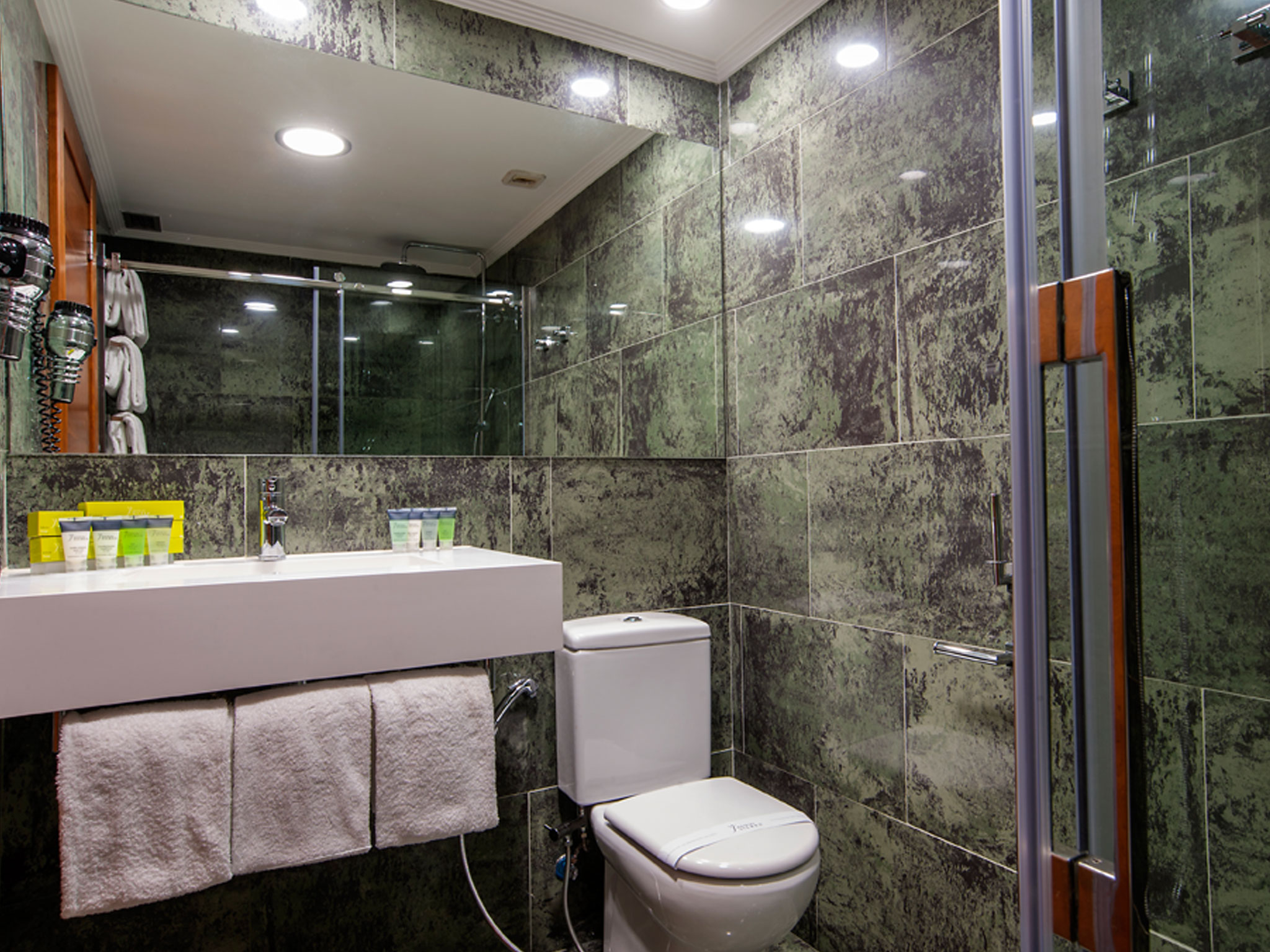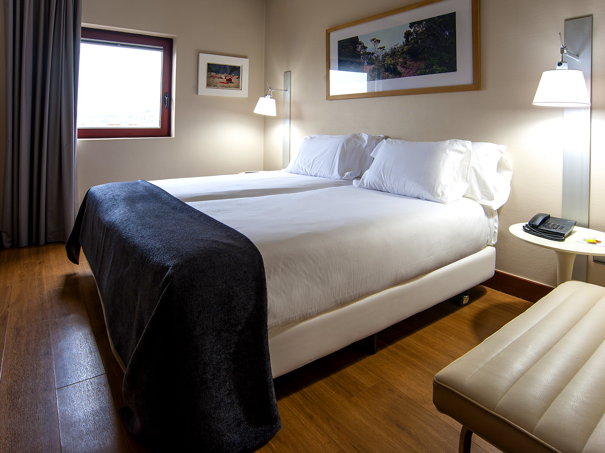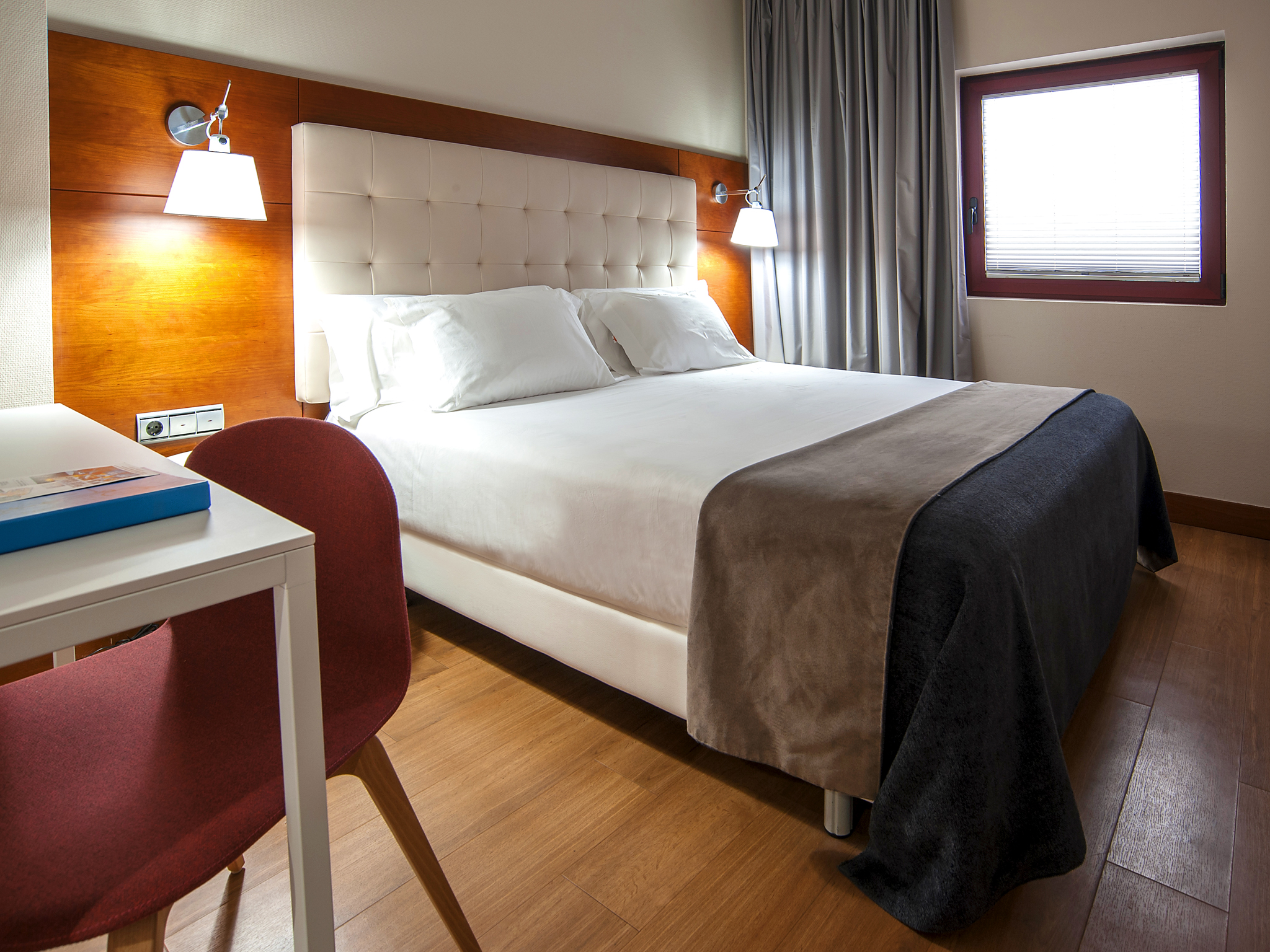 El segundo ambiente, el dormitorio, es una habitación amplia, luminosa, con un diseño funcional y de actualidad y dispone de edredón nórdico y almohadas de algodón. Está dotada de una cama de matrimonio, amplio escritorio, conexión Wi-Fi gratuita y una TV LCD de tecnología led con conexión satélite a diferentes canales temáticos e internacionales. También cuenta con un amplio baño exterior compuesto por una magnífica bañera y refrescantes amenities de té verde.