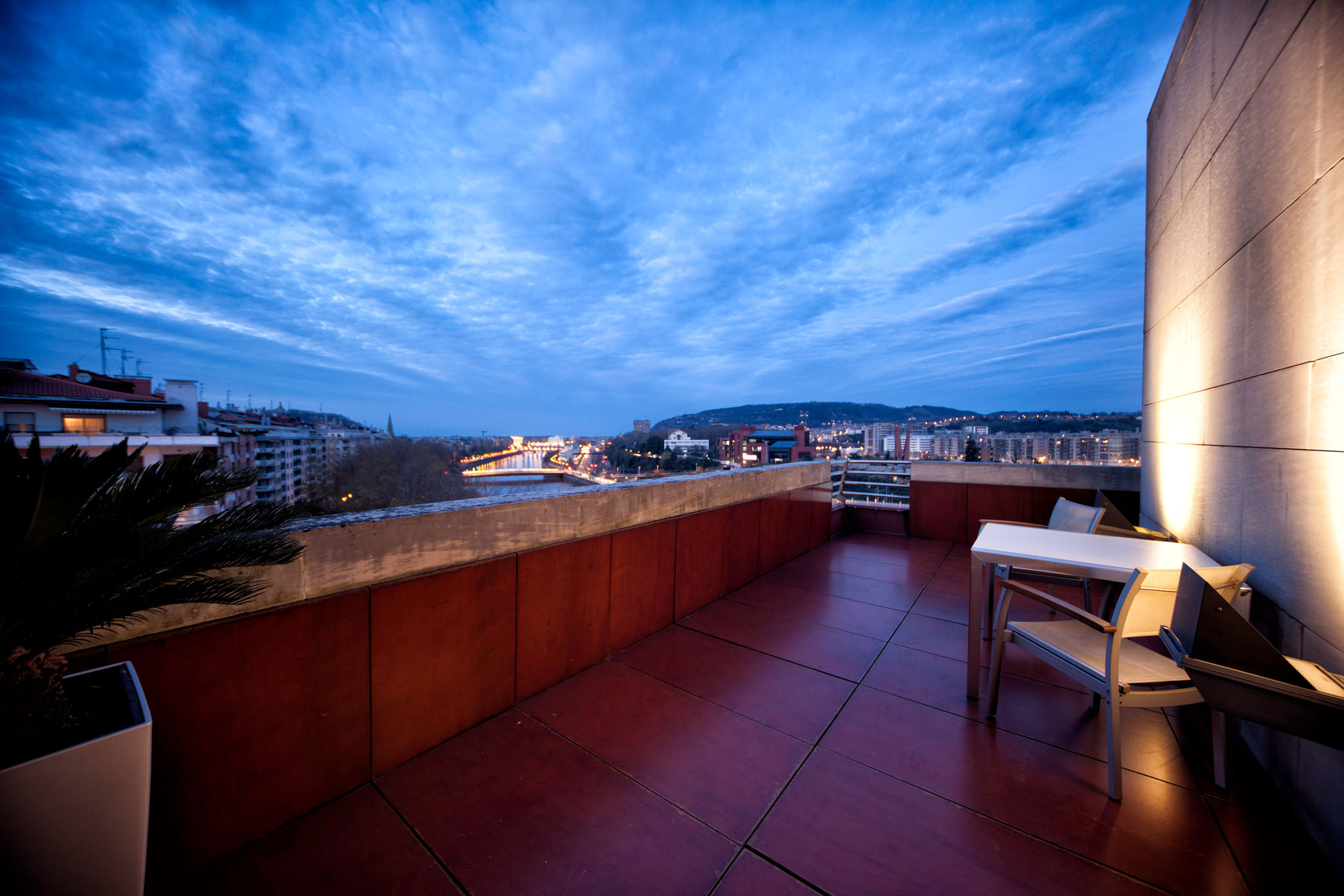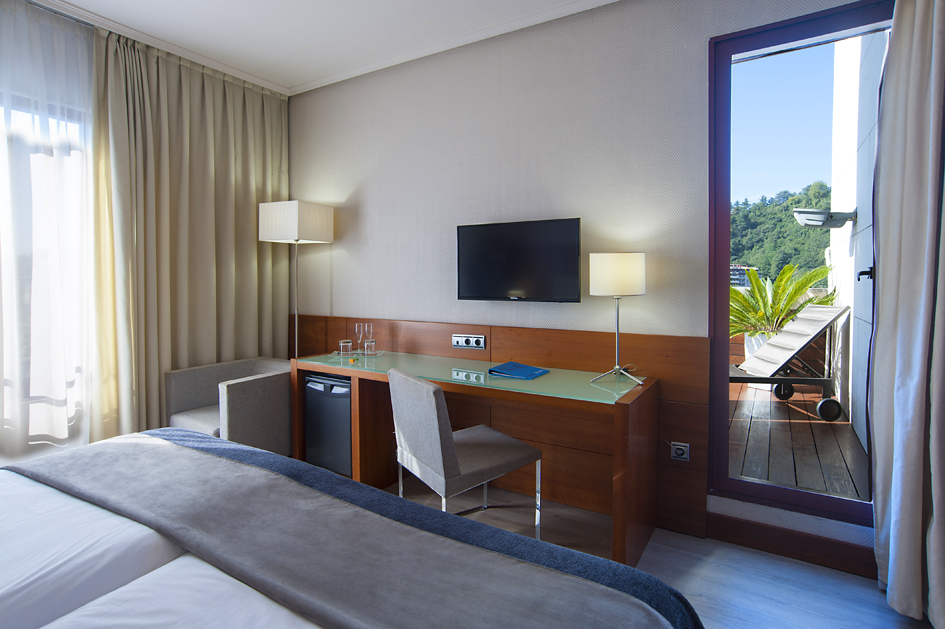 Todo un lujo a tu alcance. Desde esta habitación disfrutarás de una vista panorámica de la ciudad desde dos puntos: a través de una magnífica terraza dotada de mesa, sillas y en verano de hamacas podrás divisar a lo lejos el Kursaal y el Río Urumea; al otro lado de la habitación encontrarás otra terracita desde donde podrás observar la zona deportiva de la ciudad y el río desde una perspectiva diferente.